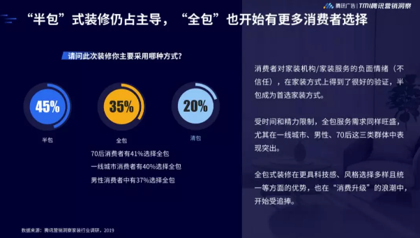 2.装修规模:整屋装修仍是主流 装修方式:半包装修和部分定制仍是主流,全包装修及全屋定制开始兴起 Pick省心省力的全包装修和全屋定制,是否已经成为当下真正的市场主流?腾讯营销洞察数据显示,受限于消费者对于家装机构/服务的信任问题,当下家装市场仍有45%的人群选择半包装修。同时,全包装修因为更具科技感坚持精准营销、风格选择多样等方面的优势开始受到追捧,尤其是在时间、精力有限的一线城市、70后、男性消费者中表现突出。
