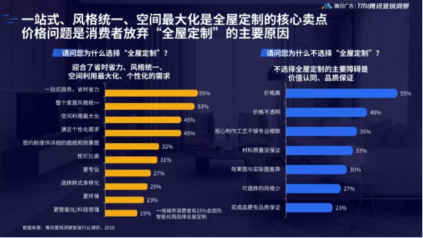 当下,一站式服务、风格统一、空间利用最大化的全屋定制的接受度正在进一步提高,这一点在爱好尝试新鲜事物的90后群体中体现尤为明显。而其所带来的智能化便捷体验也让越来越多的一线城市消费者选择全屋定制的理由之一。但与此同时,价格普遍偏高、对于工艺和材料的担忧等问题,也影响着用户对全屋定制的选择。这意味着:成都网站建设那家好未来全屋定制企业需进一步在价格、品质以及风格设计方面持续提升,才能进一步获得消费者的价值认同。