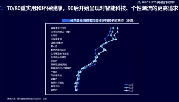 3.风格偏好:70、80后追求简洁、注重材料的品质和安全,青睐科技感与智能化的90后更多元 据腾讯营销洞察数据显示,当下现代简约/简欧的装修风格已成为主流。从消费群体年龄层来看,身负育儿重任、处于三代夹层的70、80后更加务实,简洁干净、省心易打理成为他们的普遍追求;其中有娃家庭尤其关注装修材料的品质和安全性。而作为另一主力消费群体,偏爱情感享受90后对智能化家居更感兴趣,有科技感的家装更能让他们快速“种草”。