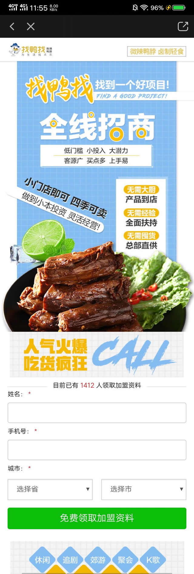 进入广告落地页,鸭脖迎面扑来,在落地页的第一屏,一般放招商海报和表单,海报内容包含概括起来的产品优势以及用户加盟优势,突出特点,然后吸引用户留下信息,天下表单免费领取加盟广告,再往下的落地页内容就可以为海报上的没一点的特点做详细的介绍,让用户进行初步的大致了解,落地页一共有两个表单,底部还会出现一个表单,当用户看完资料之后再次出现一个表单可以更好的引导用户填写信息,帮助广告收集资料,提高转化。 对于招商加盟类的广告,一般用户投放爱奇艺广告和微博广告的最多,在展现方面曝光量也是非常高的,所以想要投放如何玩转快手招商加盟的广告主可以尝试投一下这两个平台的广告。