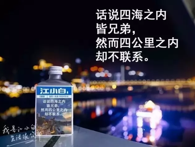 在可口可乐反转瓶上面,会有提示“喝完往内看”的字眼。随着瓶子里可口可乐的减少,充满着反转味道的文案便随之显现出来。 不得不说,可口可乐在包装和文案设计上都下足了功夫! 2.从江小白、每日C到农夫山泉,「小瓶身,大创意」 虽然说可口可乐是瓶装营销大佬级的存在,但这些跟随者的创意,也同样精彩。 以“被卖酒耽误的广告公司”江小白为例。 “话说四海之内皆兄弟,然而四公里之内却不再联系”;“有些人你明明你愿意忘记,但TA却越走越远”。