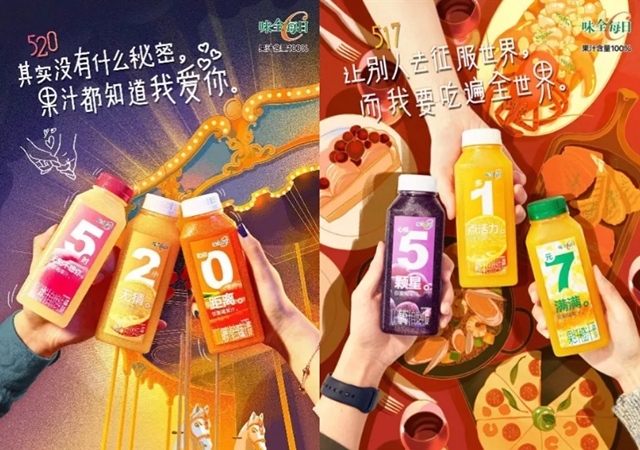 再说味全每日C最近推出的数字瓶。 “520,其实没有什么秘密,果汁都知道我爱你”,“517,让别人去征服世界,而我要吃遍全世界”。