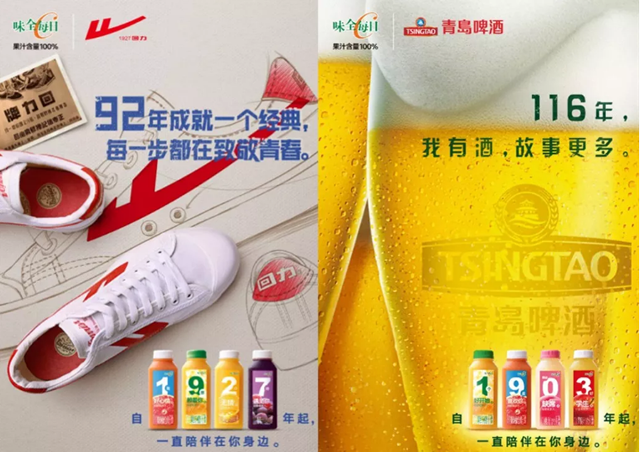 不仅如此,每日C还与其他品牌玩起了跨界,给你一个难以拒绝的理由。 “92年成就一个经典,每一步都在致敬青春”;“116年,我有酒,故事更多”。