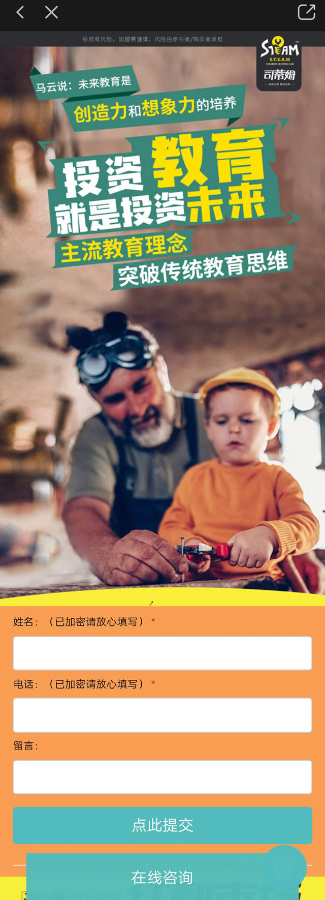 落地页:点击进入落地页,落地页的头部引用马云的一句话,激励用户突破传统教育思维,然后是落地页第一个表单信息(第一个表单信息一般是意愿非常强烈的用户填写的),往下还有更多详情,详情主要从以下几点打动用户: 1.市场上儿童教育行业现状 2.加盟司蒂姆儿童手创俱乐部的市场前景分析 3.介绍司蒂姆儿童手创俱乐部的教育理念、课程体系以及师资团队 4.加盟司蒂姆儿童手创俱乐部的内部场景展示 5.同意加盟后总部的扶持服务