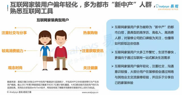 国内用户的消费升级是消费方式、观念、内容媒介与人群细分的合集,随着各类垂直购物与精细化商品品类的细分,消费者对生活品质和品牌保障的需求愈发强烈。在此大环境下一路成长起来的80、90后新生代消费群体对家居家装行业市场的促进与日俱增,互联网家居产业逐步转向了新的发展阶段。从2008年信息门户、中介平台等家装O2O的出现至今,互联网家装实现了从平台型与垂直型市场主导,到产业整合一站式服务,再到互联网家装产业链条的整合。鉴于此,互联网家居行业要如何锁定用户,开启营销新方向呢?让我们带着以下三个问题来寻找答案。 一、沉浮十年,为何说互联网家居还是一片网站后端开发蓝海? 其一,互联网家居家装得以发展,规避了传统行业中间商太多、层层分包,信息不透明,流程复杂且维权成本高的问题,消费升级的趋势下为互联网家居家装带来的是口碑、服务与保障的三重保险。 其二,受房地产去库存、二胎政策、城镇化发展、智能科技、绿色健康等因素的影响,整个泛家居行业市场体量可以达到5万亿左右,“前装修”与“装修后”均是可以加强布局的增长点。 其三,作为家装消费主力的80后、90后群体在装修观念上最看重个性化,一站式家装可以做到省心、省力,优化购物体验。智能家居是切入用户的未来场景,定制化家居在标准硬装和定制软装上可以最大限度的满足消费者需求。 二、消费升级,最精准的用户在哪儿? 根据易观发布的《2017互联网家装用户洞察》可知,互联网家装主要集中在30岁左右,移动端用户有明显年轻化的特征,他们主要集中东部地区,逐步向三四线下沉,多为都市“新中产。高消费者与中高消费者人群占比超过90%,这部分人群对生活品质要求较高,具有较强的消费能力。