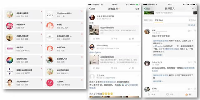 微博用户八成在30岁左右中高端人群,拥有3.13亿的月活跃用户数,与互联网家居家装人群高度融合。微博信息流产品的九宫格展示、品速Card、应用家下载实现了从展示、曝光到购买的直接参与邀约媒体公司体验,且内容的原生或多样性能获得用户的良好观感。 2、口碑运营从多维度进行 微博是粉丝的聚集地,品牌的官微运营是展示产品和调性最好的形式,同时各种互动内容和活动内容为聚集人气提供最高效的配合,品牌账号与小号的矩阵运营为口碑营销带来创新。