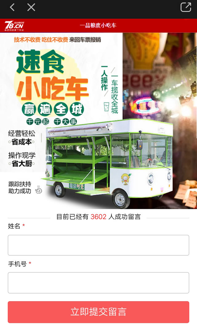 点击进入落地页之后除了小吃车外形图片展示在第一屏内容里,主要还是优惠和服务,对于加盟,用户最在意的也就是这两大块了,尤其是服务,用户需要了解到参与加盟之后企业能提供给用户哪些帮助,并且落地页在展示的时候一定要将自身的优势展现出来才能更好的吸引用户。 落地页的第一屏配图可以说是一个总结,图片下方就是整个落地页中的第一个表单了,表单可以收集意向用户的信息,用户填写信息相当于广告主收集到一条用户线索,通过后期的沟通实现合作。 再往下就是第一屏配图出现的优势的简单介绍了,只要有以下内容: 1.企业公关危机预防及解决方产品各种样式的展示(这里展示的就是小吃车型) 2.产品的优势(小吃车可以随处移动,开到任意地方) 3.主营产品(小吃车可以做的小吃种类) 4.加盟之后对用户有哪些扶持(培训、物流、广告等)