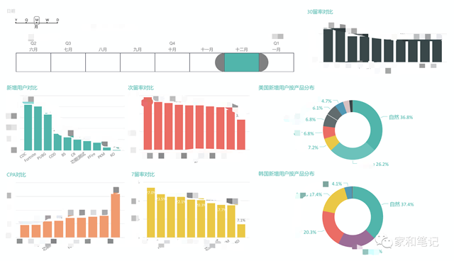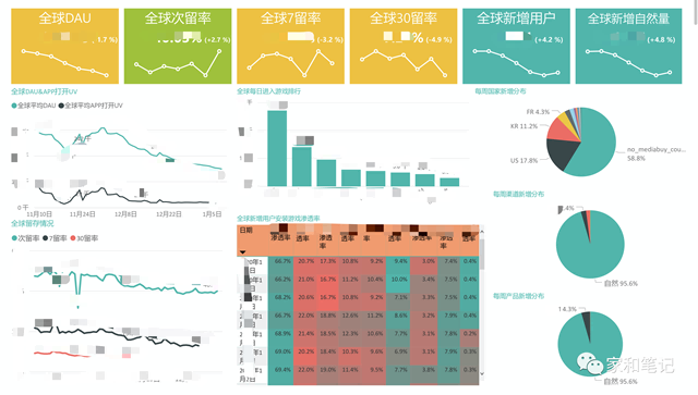 4. 数据分析 数据分析是所有工作持续良性发展前提,因此每一个运营(增长&商业化)只有会看数、及时发现异常且及时跟进解决才是一个好运营。 • 增长运营数据来源:AF、BI、GP、A网络营销的图PPSTORE • 数据维度:DAU 留存(次、7、30、长)、新增(国家、量、CPI、 渠道、版位、付费、自然、渗透率 卸载率 排查问题的时候要到 ADSET CP) • 周期:日、周、月、季度 如下示例:只是粗放的月季的整体数据,更详细数据分的更细,ASO 自然还有更多数据指标。