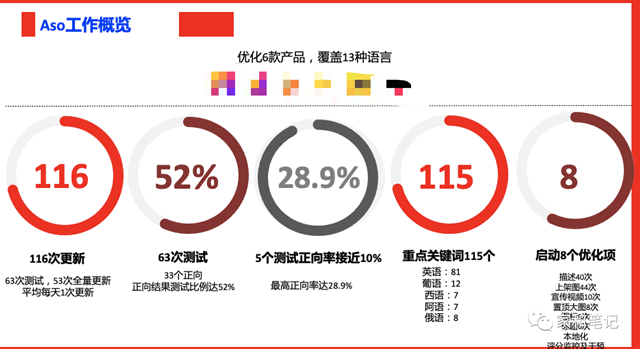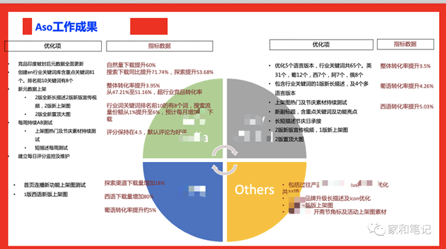 2. ASO 目标&策略 围绕自然量绝对值和相对值、CVR、热词数量、配合营销活动付费增长开展社媒运营综合小成本支持还是有一定的增长助力的,只是成果展示,每一个模块的数据分析能力都非常重要。 示例 1: 曾经带的增长团队君妍完成