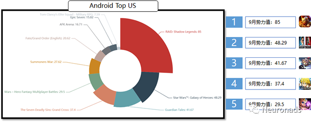 在英美澳加德法俄中东这么广泛的区域内,玩家对卡牌 RPG 的口味是颇为一致的,对硬核写实风格与卡通风格均能接受。RAID:Shadow Legends、Hero Wars、Guardian Tales、AFK Arena、Summoners War,这几款产品反复出现,各个市场都在前列。反而是依赖 IP 的作品地域性很强,例如星战就只在英美能排最前列,在亚洲很高的 FGO,德法俄看不到其身影。