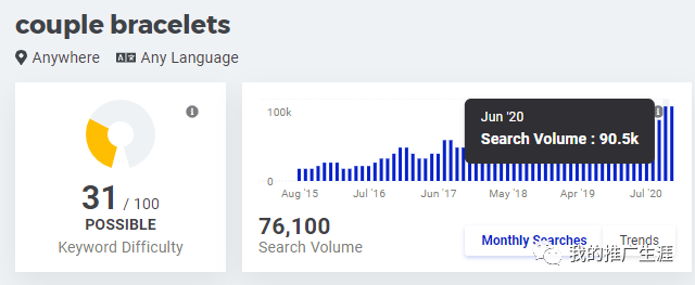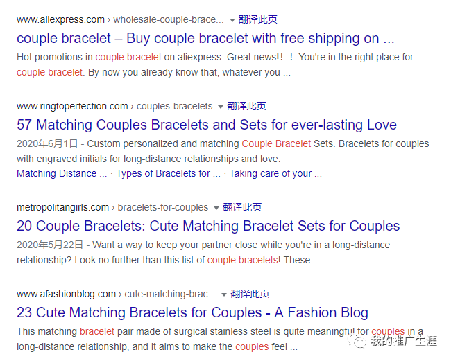 作者:我的推广生涯 (ID:FXSHKJ) 出海注:本文为我的推广生涯发布在出海专栏的原创文章,转载须保留本段文字,并注明作者和来源。商业转载/使用请前往,联系寻求作者授权。 有时候,对一些数据进行汇总分析的时候,你可以看出一些规律,当然之后再给你规律公关公司的案例也不能说是百分百正确,但是还是给我们一些比较好的提示。 我会在下面这些行业进行产品排名的分析,当然分析的话,都会以一些比较细分的关键词,例如情侣手链等切入分析。 PS:每个人在谷歌搜索出来的排名结果可能多少有差异,这是根据 IP地址、城市、设备等等因素造成的。 我下面分析是排除了谷歌图片、YouTube 视频,谷歌相关问题推荐这三个谷歌自家的产品。 1、饰品行业 案例 couple bracelets:关键词难度 31(满分 100,用kwfinder 查询),月均搜索量 7 万左右,这个关键词可以看出相当的不错。