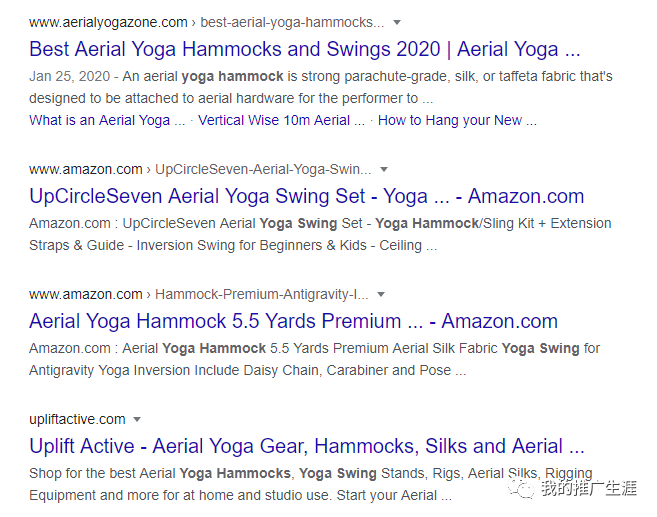 排名第二、三:Amazon 产品,Amazon 产品获取排名不足为奇,这里不多分析。 排名第四:upliftactive,这是一家专门卖瑜伽吊床的网站,外链和社交做的都不怎么样。 说到这个网站,可能很多人就有疑问,是做一个瑜伽综合类的网站还是单独针对其中某个细分类的产品搭建一个网站,哪个更容易获取排名呢? 我个人感觉没有哪个更容易的事情,还是要聚焦于产品本身,网站优化、设计这两块。
