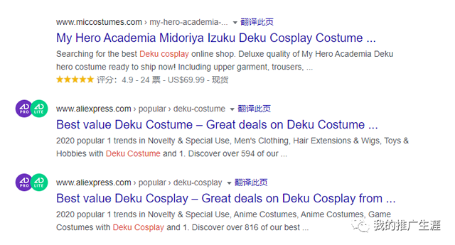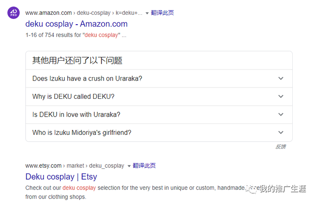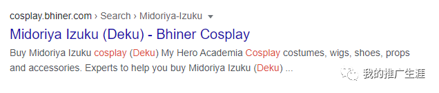 排名第一、二:Amazon、etsy,这两个网站实在是强,到哪里都有它们。 排名第三:cosplay.bhiner.com,一个大型 cosplay 综合网站,产品页面等优化的不怎么样,有时候感觉只要产品数量足够多,弄成一个综合类的网站,总会获取不错的排名和流量,不过我没有实践过。 排名第四:/www.miccostumes.com/,这个网站的一个单产品页面获取了谷歌的排名,有时候在搜索产品关键词的时候,经常会出现一些单产品网页获取排名,这往往跟这个产品的高转化率、页面的社交分享很多有关系。 排名第五、六:Aliexpress页面,很少在谷歌首页遇到两个Aliexpress网页,这是不是代表着首页的竞争比较弱?有待深入的考证。 排名第七:Pinterest,又是一个个人的图版页面,22 张 pin图,111 粉丝,怎么看都不怎么样。 排名第八:cosmanles, 又一个单产品网页获取了排名,4 条评价,属于无法具体分析的。 总结:其实大家可以搜索更多的产品关键词,首页排名不外乎这几个网站,Amazon、etsy、Pinterest、best 之类的文章网站,产品分类页面网站、单产品页面网站、谷歌自家的产品、谷歌图片、YouTube 视频、相关问题推荐等。 那么给我们的机会是:努力写 best 之类的文章,产品分类页面和单产品页面都要做外链和社交分享,要不就是从 YouTube 视频、谷歌图片、相关问题推荐入手。