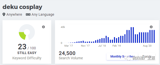 3、cosplay 案例:deku cosplay,月均搜索量最近半年都非常的不错,维持在 3 万左右。