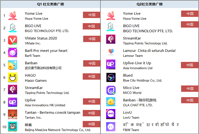 下面将分别解读游戏、社交、娱乐、小说图书、直播类的具体上榜应用。 1-1 手游推广榜 Top10,出海厂商超一半 东南亚文化多元,对外来文化接受容纳程度较高,且本土的实力游戏 CP 为数不多,自然成为了国内厂商的激烈争夺之地,产品源源不断进场买量,Q2 榜单对比 Q1 相差较大,头部手游广告主的推广周期性明显。