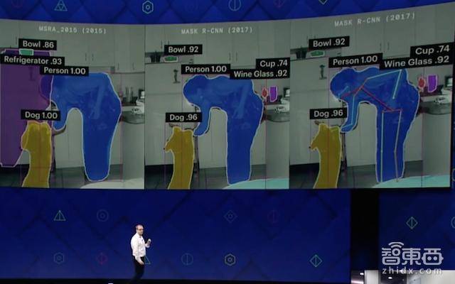 以上图这碗麦片为例,由于具备SLAM技术,系统可以判断出麦片与果汁在桌面的位置,并让生成的3D字体贴纸落在麦片后方,左右摇动镜头也不会影响3D贴纸位置。 第二点与之前支付宝与QQ的AR红包有相似之处,不过与支付宝AR红包根据图像匹配识别不同,Facebook的AR数字标签是基于地理信息+物体识别的。 能做到这几点,少不了人工智能的强力加码,会上Facebook CTO Mike Schroepfer专门提到了Facebook人工智能研究院的院长、深度学习三巨头之一Yann LeCun教授在DeepMask图像检测、分割、识别等技术上的研究。另外,Mike Schroepfer还提到,现在Facebook不仅能够分割出,还能够生成人类3D骨架主架构(如图)。
