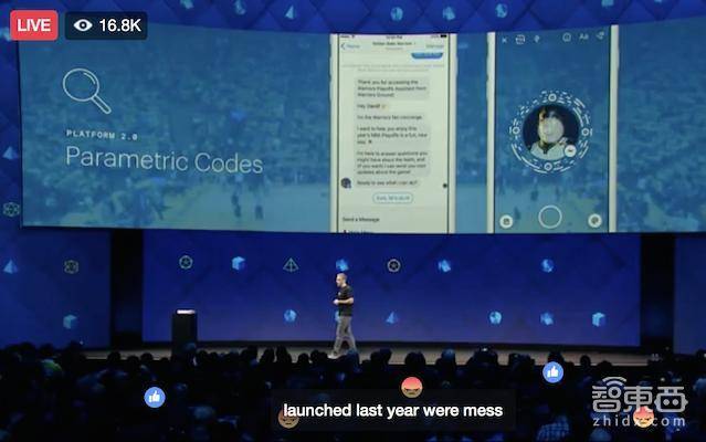 去年扎克伯格曾预言,VR/AR的最终形态是一副轻便的AR眼镜,此言论在一年里被世界各地的AR眼镜厂商不断提起。然而今年F8上,扎克伯格却意外地发布了一个基于手机摄像头信息的AR平台,矛头直指和Facebook针锋相对的AR软件Snapchat。此外,还有去年10月就展示过的VR虚拟社交形象、以及推出了Messager Platform 2.0——Messenger是一款类似微信的社交产品,具备许多微信已有的功能。 总的来说,这届F8开发者大会不行——哪怕小扎使出浑身解数讲了好几个速8的笑话也不行(最近火热的好莱坞大片《速度与激情8》的英文缩写也是F8)。 一、遛粉有方:一款叫“相机”的AR软件平台