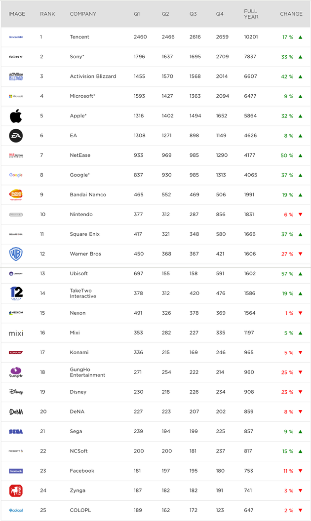 游戏营收排名前十的科技公司 北京时间3月24日消息,市场咨询公司Newzoo公布报告称,按游戏营收计,腾讯再次在25家最大的上市游戏公司中排名第1位。2015年,腾讯与游戏相关的营收达到87亿美元,2016年增长17%,上升至102亿美元。2016年25家最大的上市游戏公司总营收同比增长17%,达到704亿美元。 大型游戏公司不断整合,这种趋势更加明显,前10家公司占了产业营收的54%。腾讯拥有《穿越火线》等游戏,它还向Riot Games、Supercell、Epic Games等公司投资。腾讯占了全球游戏市场的10%。Supercell是腾讯子公司,腾讯控制了84%的股份,如果将Supercell的营收包含进去,腾讯的市场份额达到13%。 2016年整个产业的营收增长主要归功于前10大游戏公司,它们的业绩增长强劲,营收同比增长24%,达到537亿美元。 有一些增长来自收购,比如动视暴雪收购了King。尽管如此,大部分增长是以有机形式完成的,来自于行业领导企业,由此可以看出,今天的市场领导者拥有持续的竞争优势。 再看排名11位至25位的企业,总营收约为167亿美元,基本持平,几乎没有增长。如果按单个企业来看,企业的“命运”不太一样,有些表现很好,有些营收明显下滑。 纯粹的大型移动游戏公司(比如Gree、Gung-Ho、Mixi)表现并不是最好的,这点倒是比较有趣。表现最好的是传统游戏企业,比如Take-Two、Square Enix、Ubisoft。去年,索尼和动视暴雪是排名第2和第3的游戏公司,营收分别为78亿美元和66亿美元。 网易的游戏营收同比增长50%,在25家上市游戏公司中增速最快,2016年营收达到了42亿美元。移动游戏成为网易的增长动力。2月份,在中国营收最高的5款iOS游戏中,网易占了4款;在Android平台上也占了3款,2017年网易应该会继续保持增长态势。