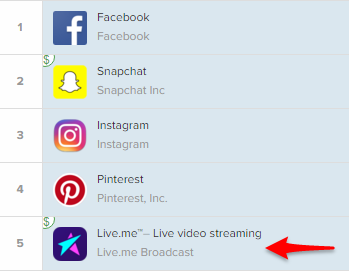 2016年8月23日,Live.me在美国Google Play社交榜排名情况。图片来自App Annie。