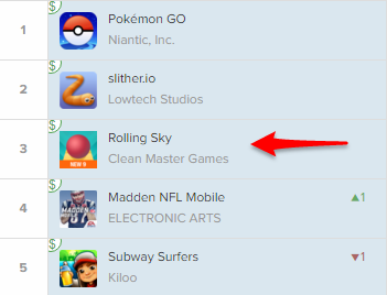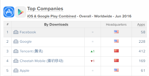 2016年8月23日,Rolling Sky在美国Google Play游戏榜排名情况。图片来自App Annie。 估值 据世界领先的App分析公司App Annie,从下载量来看,6月全球前5的App发行公司分别为Facebook、谷歌、腾讯、猎豹移动、苹果。