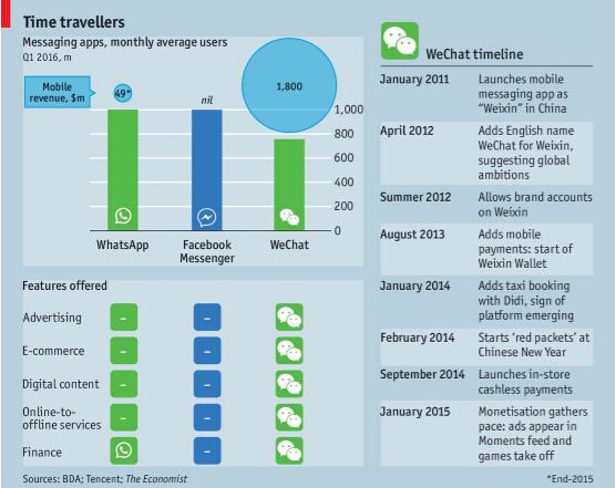 可能所有的小程序免费加盟消息平台都希望能成为微信:它伴随用户经历日常生活中的方方面面,在用户的心目中,微信是一个不可缺少的服务。用户不仅可以与朋友、群组或陌生人聊天,还可以开展业务或电商活动,访问金融应用、玩游戏,甚至可以连接到各种物联网设备。 虽然微信的活跃用户数量增长慢于Facebook,但在货币化和用户参与度上,微信却是一马当先。 据KPCB分析师玛丽•米克估计,中国用户平均每天使用微信70分钟。而Facebook表示,其用户每天在Facebook、Instagram和Messenger上花的时间总共约为50分钟。 微信的做法和Messenger很类似,也是在其生态系统中集成了第三方应用程序。但是,Messenger才刚刚起步的事情,微信已经获得了成功。市场分析机构eMarketer的报告估计,微信每用户平均收入超过7美元,其用户绝大多数都在亚洲。 而Facebook在亚太地区的每用户平均收入去年仅为5.45美元。 微信有很多地方值得Facebook学习。比如使用微信钱包,用户可以叫出租车,还可以缴纳水电费帐单,购买电影票,预订酒店,或者享受折扣,还可以在京东购物。 当你询问用户在微信上的体验时,你听到的往往是溢美之词。微信做得特别好的一个地方,向目标群体提供定制的体验。 更重要的是,微信不断提供新的创新功能,持续给用户带来惊喜,在这一点上,微信遥遥领先其他消息平台。新年抢红包就是一个很好的例子。 Facebook的Messenger虽说是个不错的交流平台,但到目前为止,它没有提供和用户群细分相关的任何惊喜。 而且还一个很大的不同之处,就是微信不仅是一个消息平台,而且还具有社交网络元素,用户可以在微信上更新自己的状态,或者关注名人或品牌的公众号。在中国,品牌经常使用微信作为公关、内容和品牌营销的主要渠道。 Facebook也明显有这个打算,但它缺乏微信在中国的那种影响力。 微信真正的大招是对支付功能的整合。这个功能不仅使用起来很容易,而且很有趣,你可以汇款给朋友,也可以付钱给商家,有时候还可以享受折扣。因此在中国的大城市,有些人已经完全放弃使用现金。 Messenger的最大机遇是在印度这种和中国很相似的市场。但Facebook迄今仍然把侧重点放在美国市场。Facebook应该尝试转移重心,借鉴微信在电商中的做法,这可以帮助它提高在亚太和其他地区的每用户平均收入。 人们在Facebook上分享的内容越来越少,Facebook尚未找到扭转下滑趋势的真正途径。虽然Messenger拥有庞大的用户群,但它需要保持创新力,想用户所想,而不是一心扑在赚钱上。
