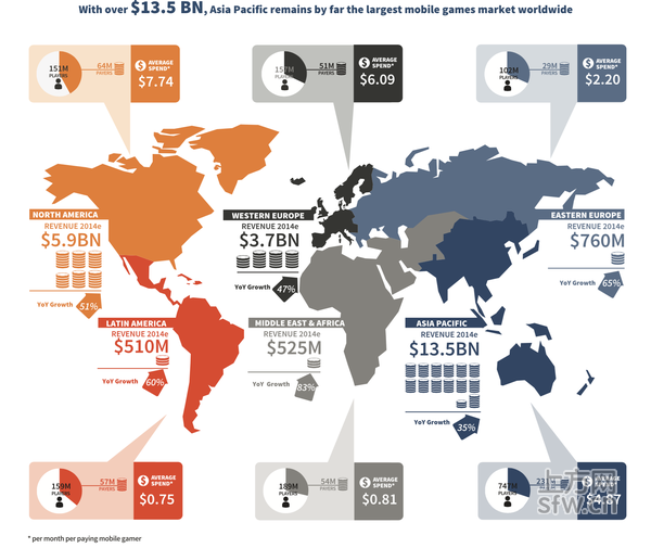 近年来,中国游戏市场红利不再,竞争也越发激烈,无论腾讯、网易等手游大厂,还是刚崭露头角的手游创新团队,都想稳固国内市场的同时,拓展手游海外市场,甚至将出海作为其今年乃至未来发展的重点。那么当大部分的厂商都将目光聚焦到海外市场之时,如何做手游的推广将成为其必须面对的问题。上方网记者在此次的ChinaJoy期间采访也听取了不少的出海建议。在这一基础上,参考各种干货资料,罗列出一下干货资料,希望未来,无论是大厂还是小团队,都能在海外市场顺利远航。 企业需要了解并确定自身要进入的海外市场 目前北美和西欧市场容量大,竞争激烈,增长缓慢,但是用户消费能力好。南美市场增长快,但是用户的消费能力一般。亚洲市场众多的游戏厂商都了解,市场容量大,增长快,当然竞争也是相当残酷的。 下面这两个图(2014年底的)可以描述了全球手机游戏市场的局势。