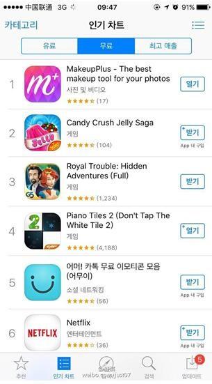 近日,中国的美妆相机(英文名:MakeupPlus)再次登顶韩国App Store免费总榜。早在今年1月8日,美妆相机在进入韩国市场之初就曾顺利登顶韩国App Store免费总榜。