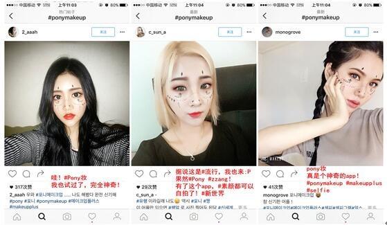 美妆相机在韩国的风靡引来了韩国知名美妆大师Pony的合作,5月18日,美妆相机就与Pony联合推出了全球独家联名妆容,用户选择上传自拍照一键点击就能拥有和Pony一样的妆容效果。