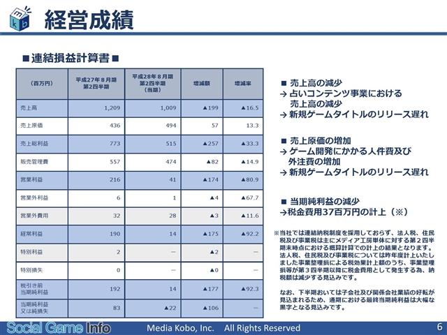 4月26日消息,日本游戏厂商media factory日前发布了2016财年8月期上班财年(2015年9月~2016年2月)财报。财报显示公司在信息流代表上半财年营收10.09亿日元,同比减少16.5%;营业利润4100万日元,同比减少80.9%;经常利润1400万日元,同比下滑92.2%;最终损益2200万日元赤字,而去年同期是8300万日元赤字。