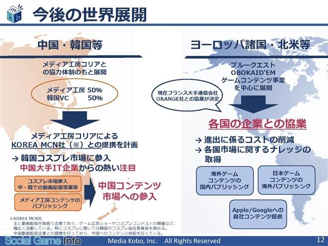 在海外战略部分,公司成立了media factory韩国,其中韩国VC投资了50%,随着韩国分公司的成立,这也将成为公司下半年的营收支柱之一。韩国分公司已经与韩国MCN商定,共同举办游戏广告秀以及cosplay大赛等活动,之后还将以此为契机转战中国市场。另外在游戏方面,不单单是和谷歌和苹果的合作,公司还将加强与各个第三方平台的联动,其中就包括法国的通信巨头ORANGE。