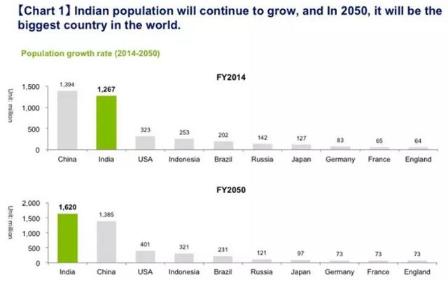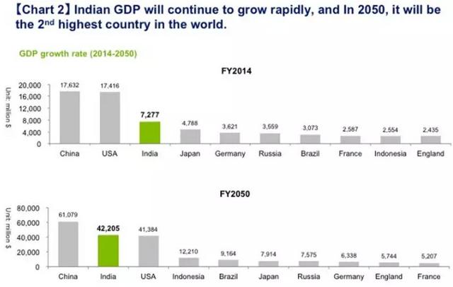 目前来看,全球主要的经济依旧集中在北美、欧洲、日本等发达国家,但由于发展的陷入瓶颈,缺乏新的增长力。可以预见,已经成为新兴大国的中国将在2020年面临经济增长的问题,另一方面,印度市场的急速增长,也被认为是之后长期吃撑世界经济的主战场。一方面,印度国土面积是日本的9倍,目前拥有12亿的人口数量,仅次于中国。根据此前的预测,中国在2030年人口数量将出现下滑,与此同时,印度还将持续增长。到2050年,印度人口将增长至16亿,位居全球首位。