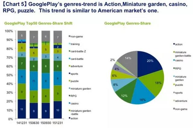 印度手游市场游戏类型倾向(GooglePlay和iOS) 从AppStore和GooglePlay来看,动作、板球、箱庭、博彩和RPG类的游戏所占比例最高。在这之中,以Supercell的“部落冲突”、Machine Zone的“Game of War”、 King的“糖果传奇”表现尤为亮眼。与其他国家不同的一点是,印度市场受海外厂商的影响十分严重,移动游戏收入Top50的产品中,90%以上来自于海外企业。对于游戏的收费问题,印度玩家也在逐步养成F2P的的文化习惯,但目前的情况是,由于中间层收入普遍较低,加之持有信用卡的玩家相对较少,故此付费门槛也较高。