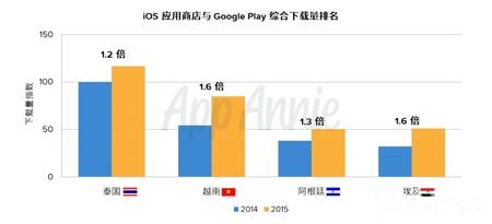 泰国、越南、阿根廷和埃及iOS和Google Play综合收入排名 随着应用经济持续发展和竞争加剧,2016年发行商需要挖掘更多机遇。App Annie认为在全球市场中,泰国、越南、阿根廷和埃及最值得期待。 在下载量和收入方面,泰国、越南服务营销策划、阿根廷和埃及市场从2014年至2015年的增长率呈飙升态势。越南和埃及的同比下载量增长率达60%,而且所有4个市场的收入增长率都在30%到40%之间。