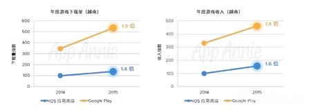 越南iOS和Google Play年度游戏下载量与收入 其中,在2015年,手游在越南的Google Play和iOS两个平台下载量都占据了近50%的份额。除了下载量和收入增长外,越南本地开发商也正在崛起。其中包括游戏《Flappy Bird》预计纸牌与博彩游戏。