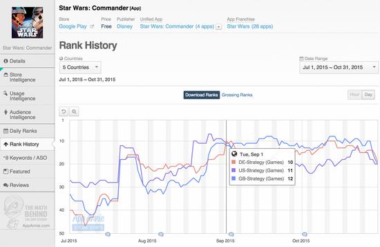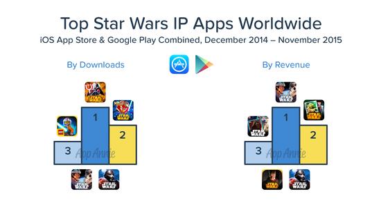 《星球大战:原力觉醒 (Star Wars: The Force Awakens)》作为全球最受欢迎的系列电影之一中的第 7 部,将于2016年1月9号在中国上映。近 40 年来,这一系列塑造的丰富角色已出现在 6 部电影、动画、漫画、游戏和其他媒体形式中。此系列 IP 实力也许只有迪士尼旗下的另一张王牌——漫威 (Marvel)可与之媲美。 目前,网络上围绕这部电影的讨论进行得如火如荼,11 月的票房预售收入已经高达 5,000 万美元,未来几周将检验星球大战的品牌竞争力。在大银幕之外,星球大战也是一股不容小觑的力量,电视连续剧《星球大战:反叛军之战 (Star Wars Rebels)》即是证明。但现在,我们先重点来关注一下星战系列在移动应用中的成功历程。 《星球大战:原力觉醒》助力移动应用在大银幕之外中,星球大战的魅力依然势不可挡,热门电视连续剧《星球大战反叛军》即为实证。 当然,这一品牌也懂得如何充分利用移动渠道来吸引新老粉丝。星球大战系列新手游如《星球大战:指挥官 (Star Wars: Commander)》和《星球大战:起义 (Star Wars: Uprising)》在上个月已经有很高的下载量。随着时间的推移,这些应用可能会超越过去几年在 iOS App Store 和 Google Play 中稳居排行榜前列的星战应用。 星战品牌还在继续发行移动应用,将《星球大战:原力觉醒》的火爆转化为利润。Electronic Arts 在 11 月底发布的《星球大战: 银河英雄传 (Star Wars : Galaxy of Heroes)》在未来应可成为星战系列游戏的主力军。 App Annie 市场营销与传播副总裁 Fabien-Pierre Nicolas 相信这款游戏能够跻身收入排行榜前茅。“我们预测 EA 的《星球大战:银河英雄传》将成为热门应用,因为它已经在美国 Google Play 收入榜排名前 20,在 iOS App Store 收入榜排名前 30,这都得益于两大平台的大力推荐。” Nicolas 预计这种增长趋势会持续到明年。他表示:“随着电影上映和圣诞期间新移动设备的激活,预期游戏的用户基数在 12 月和 1 月将继续增长。”
