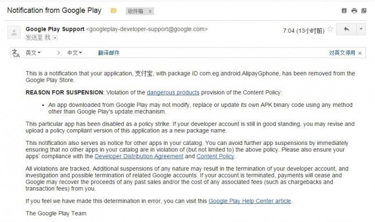 此为Google Play发给支付宝团队的邮件截图 邮件里标注的下架原因是违反了“Google Play中下载的应用不可使用除Google Play升级机制以外的方式对其APK二进制代码进行修改、替换和升级操作"条款。 这项开发者政策是今年4月推出的。据悉,政策的Dan电商活动运营g危机公关 事实与价值模型erous Products(危险产品)项目中规定开发者不允许发出恶意软件、病毒、安全漏洞及欺骗信息,目的是“阻止含恶意代码的应用渗透在用户设备上”。 支付宝称修改后的安装包已经打包,重新上传。