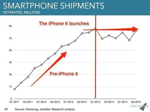 在 2014 年中之前,三星看起来一直非常自信,因为对于他们来说要拿下智能手机市场的大部分份额简直易如反掌,智能手机市场的大部分收益也自然而然跟着进了三星的口袋。 三星已经准确预测到智能手机市场需要的是大屏幕的设备,消费者已经越来越习惯5英寸的设备,这类设备的销量也迅速飙升。曾经有一段时间,大屏智能手机市场堪称三星的天下。 但是那时候还在销售 4 英寸 iPhone 的苹果则有不一样的计划。 从 2014 年 7 月份起坊间逐渐曝光关于大屏幕 iPhone 6 和 iPhone 6 Plus 的消息,而对于三星来说形势也是从那时候起急转直下。2014 年假期季苹果公司 iPhone 的销量为 7400 万,重振销售雄风,也再次巩固了全球市值最高的公司的地位,创造了 180 亿美元的利润。? 但是竞争对手三星则是另外一番光景,销量和利润持续下滑,一年半之后才稍有回缓的迹象。 最近调查机构发布的统计数据显示,苹果和三星仍然在智能手机市场占据了 105% 的利润(注:超过 100% 利润的原因是不少手机品牌在亏本)。苹果和三星独占智能手机的利润,这消息并不新鲜,但这回三星即使在本季终于重拾升轨,但流失率分析它与宿敌苹果之间的利润差距却是进一步的扩大。更严重的是:苹果占据了全球智能手机市场利润的 90% 以上,即九成的利润都被苹果吃掉了。 福布斯 (Forbes) 更表示:这种情况继续下去,预期苹果在 2016 年将会占据 100% 的全球手机市场利润。即使三星的利润重拾升轨,但利润率的增长幅度仍然与苹果相差太远,只能减缓被苹果抛离的速度。 以下就是 Jackdaw Resea公关处理公司rch 发布的数据统计图,苹果进入大屏幕智能手机市场之后到底发生了什么,我们只要看看这两张图片就明白了。三星的手机销量可以分成两个阶段,“iPhone 6 发布前”和“iPhone 6 发布后”。