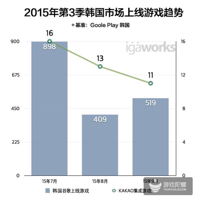 今年第三季的韩国手游市场依然是一片红海局面。很多新游上线,但进入榜单前列的寥寥无几。7月至9月间,韩国市场上线游戏总数1,826个,其中Kakao游戏数量持续减少。主要原因可总结为,韩国市场是以RPG为主的市场,大部分韩国开发商集中于RPG游戏的开发。