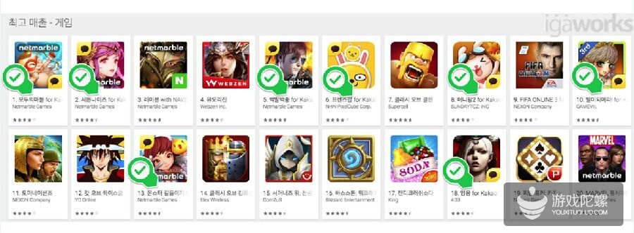 如果您的游戏是休闲类的话,不得不考虑Kakao平台。因为到目前位置,Kakao依然是大量获取轻度用户最有力的渠道。以10月12日数据来看,谷歌畅销榜Top20中Kakao游戏占到7个。说明游戏是否能登入畅销榜前列,Kakao的影响力依然存在。