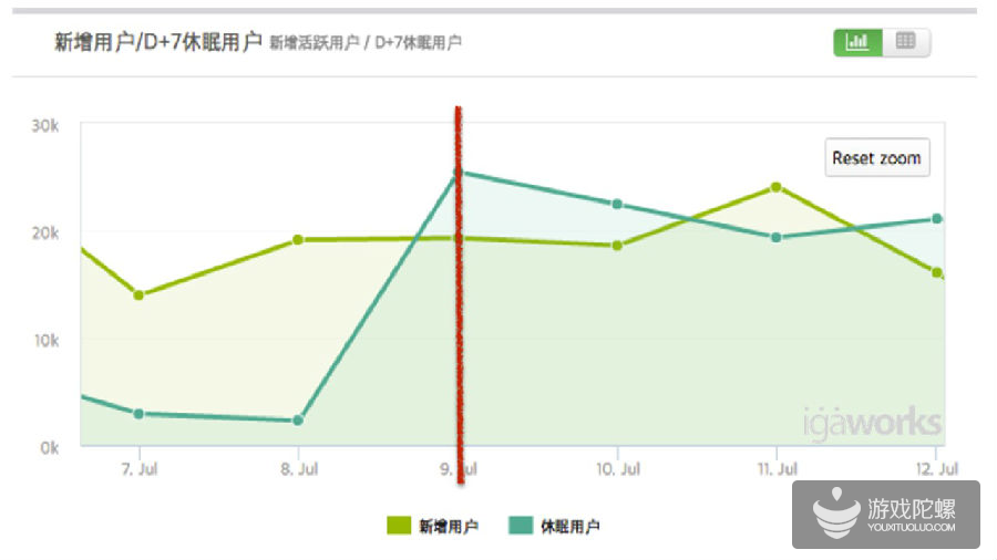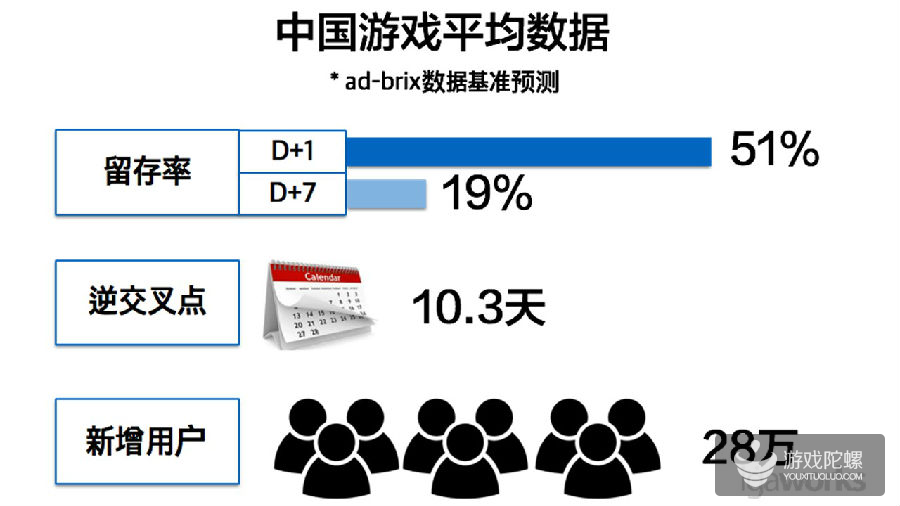 7月9日,休眠用户数首次超过了新增用户数,这是危险警告。这代表游戏里全体用户数开始减少,这时开发商需要准备防止用户流失的方案来应对。比如通过推广活动获取新用户,向老用户提供奖励优惠或者更新游戏内容等等。这些方法可以帮助游戏维持“新增用户>休眠用户”的状态。因此从游戏上线后,到新增用户数和休眠用户数交叉的时间点,我们说“逆交叉点”。 一般情况下,游戏上线时新增用户数高于休眠用户数。可是当上线期间越来越长时,新增用户必然减少,相反休眠用户逐渐增加。所以当“逆交叉点”来的时候越晚,说明开发商的游戏运营能力越好。 所以为了能快速应对用户数量下滑的危险,韩国公司常常使用第三方的运营工具。比如,当“逆交叉点”来临时,marketer为了防止用户流失需要在第一时间决策活动方案并立即执行。但在实际操作中,大部分需要开发队的帮助才能完成。不仅造成活动时间延迟,也加重开发人员工作负担。然而通过第三方工具的话,marketer可以在没有开发人员帮助的情况下自行完成。这就是为什么韩国公司的marketer在游戏上线前会事先要求集成推广渠道分析工具,用户定向推送和优惠券发行等第三方工具。 专业的第三方工具可以快速明确地传达“逆交叉点”等数据信息,并提供实质性的解决工具。举例说明一下。 1) 当新增用户数增加时,我们可以查看非激励渠道中获取的用户数,挖掘优质渠道。从而有效地调整活动预算,实现ROI最大化优化。 2) 当休眠用户数增加时,为了防止用户流失,我们可以使用定向推送工具向网站防攻击休眠用户推送活动内容(re-engagement)。 所以在韩国第三方工具的竞争日渐间白热化。代表的服务有:ad-brix, tune, appsflyer, adjust, partytrack,kochava 等。 第三大因素:新增用户 新增用户是首次启动游戏的用户数。这里包括自然流入的用户,和通过推广渠道流入的用户(奖励型和非奖励型的广告产品)。所以通过新增用户的增减我们会知道推广效果和游戏上线初期的趋势。 目前, 中国游戏在韩国市场有强大的竞争力。从游戏内付费设计来看,中国游戏比韩国游戏更高一筹。这时为什么谷歌畅销榜Top100中有20个是中国游戏的理由。但是中国游戏也存在缺点,比如缺少跟用户的沟通,不善于使用当地常用的分析工具来快速对应,缺乏对当地有效推广渠道的了解。这些部分是韩国开发商的优势。 所以中国游戏想在韩国市场的成功的话,必须坚持努力寻找适合当地的方式,持续不断地与当地合作伙伴进行沟通。