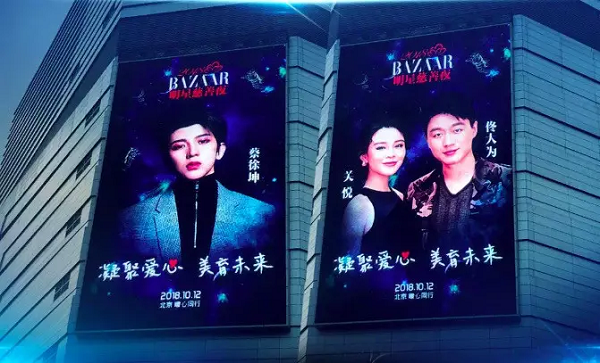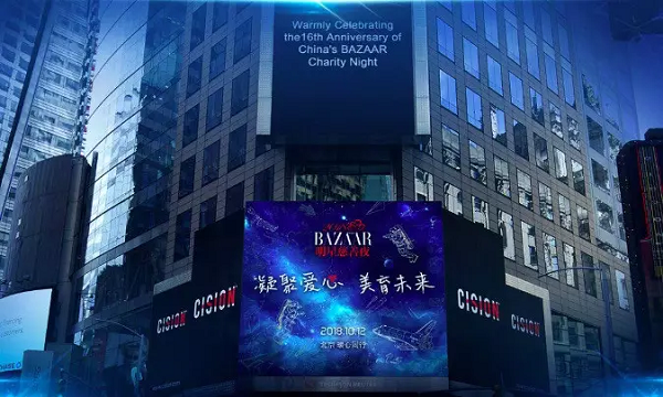 2018年的芭莎明星慈善夜无数极具影响力和爱心的明星、社会名流和慈善人士也共同为爱发力,李冰冰、佟大为、杨幂、佟丽娅、雷佳音、王俊凯、易烊千玺、蔡徐坤、关晓彤等众多明星亲临现场.场外,芭莎明星慈善夜还在纽约、北京、上海、天津投放了一波户外LED大屏广告. 纽约时代广场路透社LED大屏广告: ![]() 上海环球港双塔字幕广告: ![]() 上海静安大悦城LED大屏广告: ![]() 北京朝阳大悦城LED大屏广告医疗器械宣传海报: ![]() 天津国际机场候机厅刷屏广告: ![]() 芭莎明星慈善夜的举行募捐善款达3微博数字营销000余万元,在几大城市的地标建筑上投放霸屏的户外广告,将"凝聚爱心,美育未来"这一活动主题散发出去,并用实际行动去传递善念,引起社会极大的关注.