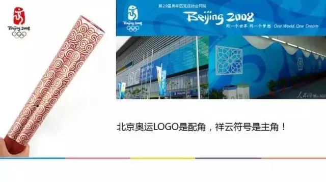![]() 3、北京奥运会的形象和logo,其实奥运会的logo是个配角,是一个印章的形式表现,但是奥运会是全球的盛会,这样的造型会让外国人看不懂。但是火炬核心的识别符号是祥云,祥云这个符号大家都会明白是中国的一个元素,包括一些场馆和场景广告的符号都是以祥云为主角的。