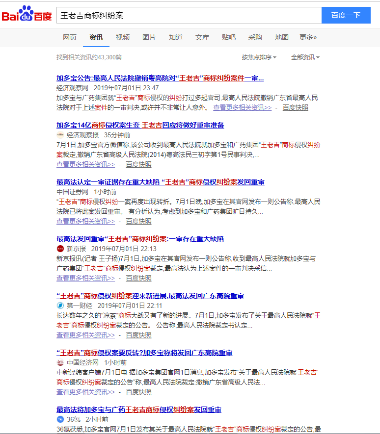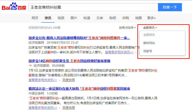从最早的“媒体网站”,到给“百家号”导流,再到“百家号”优先展示+“媒体网Facebook站”补充,百度资讯的展示经历了一个轮回。认为,此次调整对于用户来说是提升了用户的体验,对于SEO来说,则要更加重视百家号的优化,同时也要抓住重点平台进行优化。具体原因分析如下: 1、百家号的搜索占比独大 在全部资讯分类中,百家号的权重和排名是非常高的。相同时间发布的信息,内容相似,百家号更靠前。以热搜“王老吉商标纠纷案”为例,在全部资讯中有多达9条是百家号的内容。值得一提的是,并不是所有关键词的搜索结果都有百家号参与,比如“一带一路”,如果只选“百家号”,显示结果是0,说明百家号在这方面进行了管控。