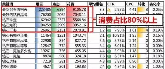 以上图为例,该账户消费最大的是通用词,其次是品牌词,各占 40%左右,而收益最大的是品牌词,占了总体收益的 89%,消费更多的通用词收益仅有 11%。通过比重分析可以看出,应该着重推广品牌词。 三、TOP N 分析法 TOP N 分析法是基于数据的前 N 名汇总,与其余汇总数据进行对比,从而得到最主要的数据所占的比例和数据效果。 1)类似二八原则,找到消费/效果占比 80%的数据,有效帮助定位问题,避免过多的数据把问题复杂化; 2)定位出需要持续关注消费或转化的那些重要关键词。