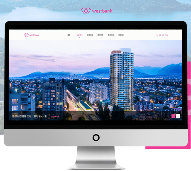 2.西岸置业(房地产行业) l 现代元素设计和易于操作的导航。 l 文字伴随流畅的动画效果出现和消失,让访客产生一种参与感,想继续往下浏览。 l 利用满屏的概念,充分展示楼盘作品 l logo主色为桃红色,用作点缀,使得有主色出现,又不抢掉主要内容。