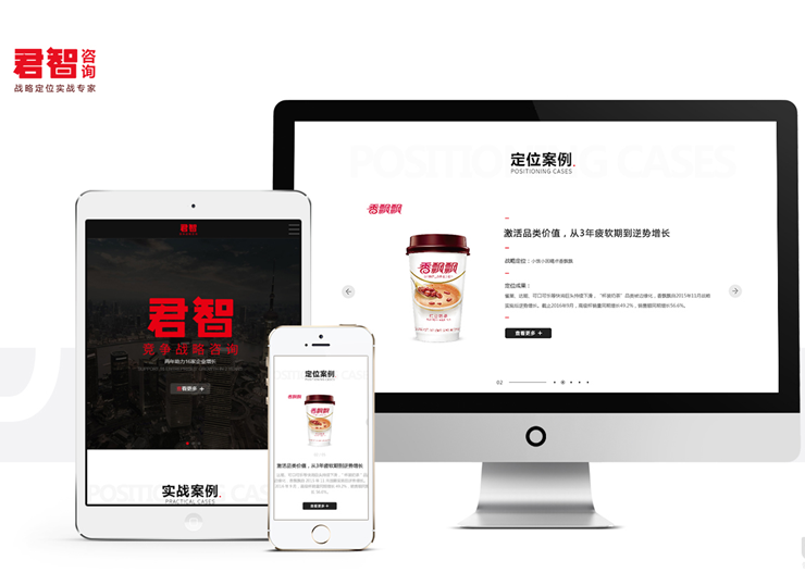 3.君智咨询(战略定位) l 红黑白三色搭配大气 l 整体页面简洁,但是又能充分展示产品和内容信息 l 有一套优秀的字体与之完美配合 l 采用左侧导航固定,右侧整屏翻滚的样式,配以分段渐出的效果