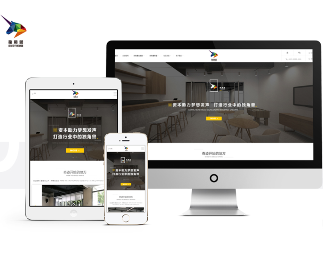 5.独角兽(办公服务) l 简洁、清晰的导航栏设计 l 响应式设计,能适应PC端、移动端和平板等设备 l 简洁的主页,丰富的口号:“资本助力梦想发声 打造行业中的独角兽” l 时尚的图标元素“独角兽”展现了企业的形象。 l 明亮的颜色组合巧妙地传达出他们提供的服务兼具趣味性和专业性。