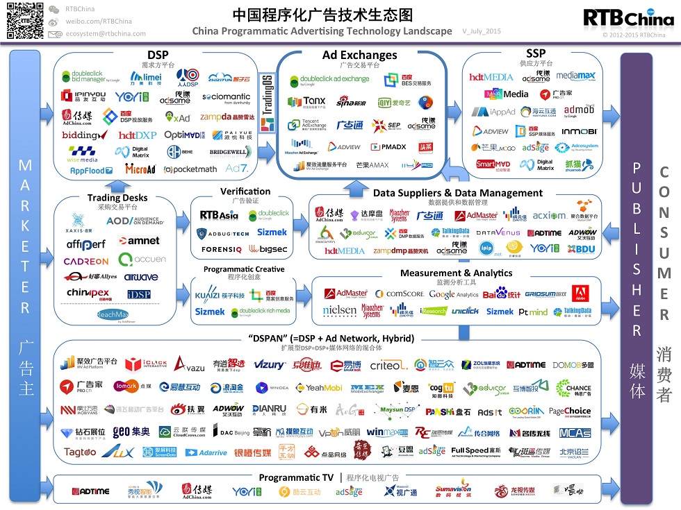 RTBChina在2015年7月更新了《中国程序化技术生态图》,与2013/2014年艾瑞、易观、DCCI等发布的产业链图相比,互联网广告在程序化购买领域愈来愈深刻地呈现出细分电视广告投放公司化和垂直化。