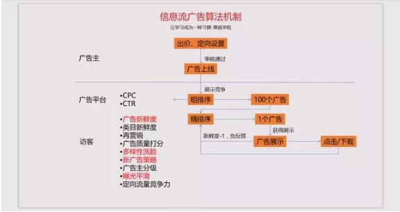 在做信息流广告的时候你可能会遇见这样的问题:你的创意,你的计划跑着跑着突然没量了或者前一天还有转化,后一天突然一个曝光都没有了。 遇见这种“没量没曝光”的问题,排除渠道限流等一些客观因素,那么就应该考虑一下信息流广告的曝光机制! 粗排序&细排序 首先,当我们设定好出价和定向以后,你的创意和账户搭建也做完了,广告就会上线接受审核。 系统审核后,就会给你一个预估,我们称之为“粗排序”,例如现在是晚上8:00,今日头条APP中某一个广告位上新了100个广告,系统会结合你的出价预估的点击率等一系列的因素进行粗排序,排序完毕后对比一下,假如有个广告它胜出了,系统就会展现这个效果最好、打分最高的优质广告进行展现。