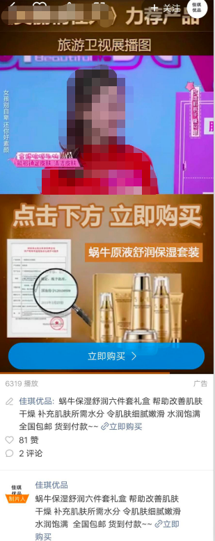 点击进入广告视频页,视频页描述蜗牛原液的“前世今生”和功效,以及当初蜗牛原液在《网络舆情监控服务系统美丽俏佳人》的表现,还有证书展现给用户,获取用户信任。 视频下方的小字部分为用户解答蜗牛北京程序开发网站原液的功效以及用户的购买优势“支持到货付款,且全国包邮”,产品是6件套礼盒。在下方的评论区还有第一条也是广告主的小字部分的介绍,在下方留言第一条更吸引用户。